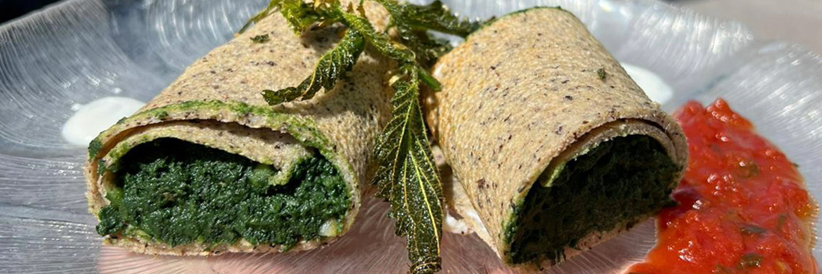 Milch, Topfen, Mehl und Salz gut verrühren. Das Ei leicht unterrühren. Wenig Samenöl in einer Pfanne erhitzen und den Teig dünn eingießen und darin 4 Palatschinken backen.Die fertigen Palatschinen mit der Brennnesselfüllung bestreichen und einrollen.